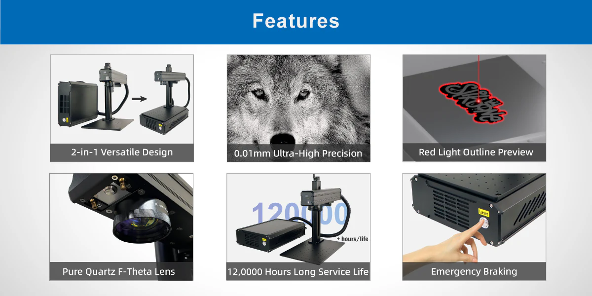 This 2-in-1 portable fiber laser marking machine offers high 0.01 mm precision and fast marking on metals and industrial plastics. It can be used as an integrated or split unit to adapt to different spaces. With a full quartz lens and dual red light preview, portable fiber laser marker ensures stable output and easy positioning. Ideal for stainless steel, aluminum, brass, coated metals, and selected plastics, 2-in-1 portable fiber laser engraver also supports precision cutting of thin metal sheets (0.3–1 mm). Compact, durable, and user-friendly, it’s a flexible solution for a wide range of marking and light cutting tasks.